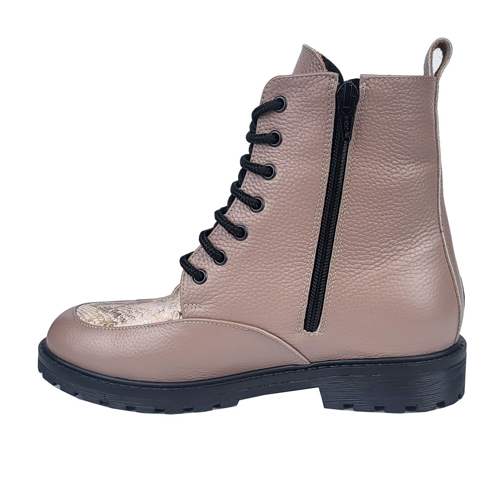 Ghete dama piele naturala la exterior iar in interior sunt imblanite, prezinta sireturi, fermoar in partea lateral interioara si o talpa rezistenta si comoda. Acest model este potrivit pentru sezonul toamna-iarna.
